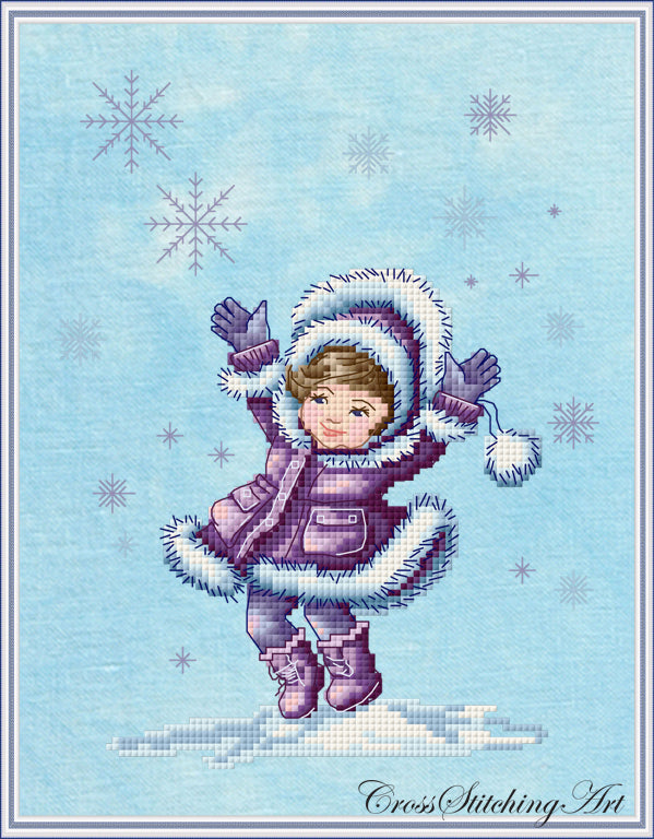 Capture the magic of winter with this charming cross-stitch pattern! Featuring a joyful child dressed in a cozy, fur-trimmed snowsuit, arms raised in delight as snowflakes gently fall around them, this design brings the warmth and excitement of the season to life. Set against a soft blue background adorned with delicate snowflakes, this pattern is perfect for celebrating the first snowfall of the year.