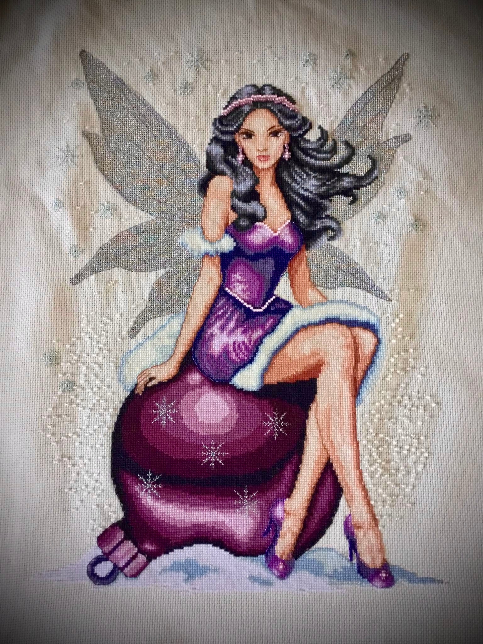 Introducing Lyriana, The Frost Whisperer – a captivating new cross stitch design that captures the essence of winter's enchantment. Lyriana, a graceful frost fairy, sits elegantly atop a frosted ornament, draped in a shimmering purple gown trimmed with delicate fur. Her ethereal wings glisten with icy magic as she gazes softly amidst a swirl of snowflakes, creating a scene of frosty elegance and holiday charm.